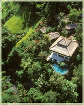 Capturing a sliver of the Petanu river's tumbling journey towards the sea, the Natura Resort and Spa is a sanctuary for the world-weary and environmentally aware. Fourteen luxury villas designed by Bali's prominent local architect, Popo Danes, enhance the beauty off the existing site. Access is through the traditional village of Laplapan, just 3 km northeast of Ubud. Snugly fitted amongst the foliage of the existing native trees, to minimize environmental impact, each cottage offers total privacy.