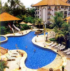 | The Sanur Paradise Plaza Hotel and Suites are located in the tranquil coastal village of Sanur, Bali. Bali has it all and Sanur is the best place to start the discovery of Bali. The Sanur Paradise Plaza Hotel commands an ideal location- just minutes from great shopping, entertainment and the cultural and natural attractions of Bali. With all rooms located around the lush tropical poolside gardens, the resort provides to all the needs of both the business and leisure traveler. The Sanur Paradise Plaza Suites is the perfect gateway for families while holidaying in Bali. Home to Camp Splash! The ultimate kids facility that features water slides and all day activities that keep the children occupied, and the parents relaxed |