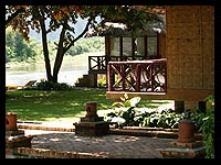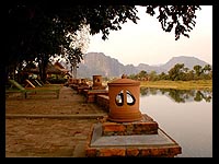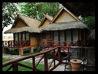 | Rustic bungalows at Ban Sabai are set on stilts and built in natural materials, some of them even incorporating mature shady trees. Winding paths up and down this tiered site lead to the river. Every bungalow has a seating verandah facing the river, as an ideal spot to relax. The Xayoh Riverside Cafe serves Asian fusion dishes along with many European specialties. Ban Sabai is a lovely spot to watch river life go by, perhaps contemplating kayaking on the Nam Song or trekking and bicycle exploration of the fascinating countryside across the river. |