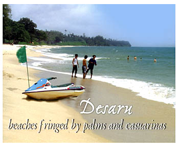 | Desaru Beach Desaru boasts 25km of inviting beaches fringed by palms and casuarinas. It lies in the southeastern corner of Johor, approximately 98km from Johor Bahru. The waters here are conducie for swimming, waterskiing, canoeing and catamaran sailing. In Desaru, you can enjoy thrilling adventures such as learning how to fly an ultra-light aircraft or take part in a go-kart race. Other forms of recreation include jungle trekking, horseback riding, archery and off-road adventures. Accommodation here includes hotels as well as budget chalets, dornmitories and camping grounds. The Desaru International Triathlon is held here annually. The Tanjung Balau Fishermen's Museum, a few kilometres away, features exhibits on the lifestyle of the local fisherfolk. How To Get There By Road - Desaru is easily accessible as there is public transportation from Johor Bahru, Kota Tinggi or Tanjung Belungkor. Buses are available from Kuala Lumpur. By Sea - There is a ferry service from Changi Point in Singapore to Tanjung Belungkor where transport to Desaru can be arranged |